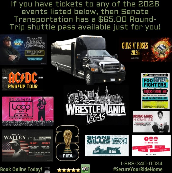For a complete schedule of our VEGAS CONCERT SHUTTLES departing various hotels in Las Vegas please log onto https://senatetransportationlasvegas.com/concerts